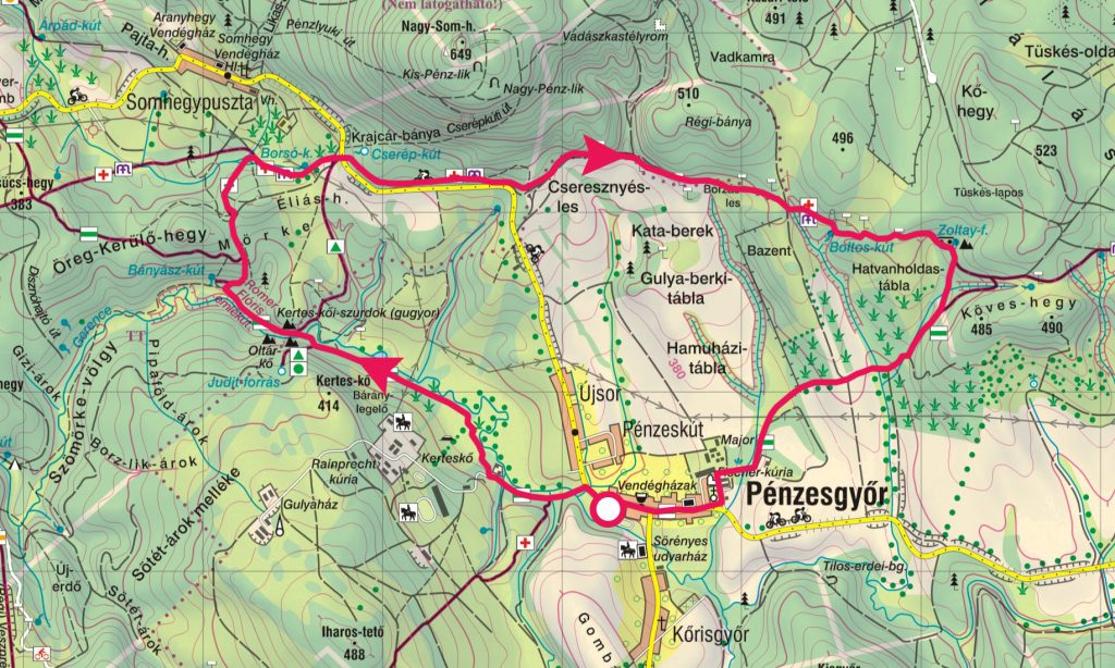 “Közepesen nehéz gyalogtúra, többnyire jól jelzett turistautakon, ösvényeken. A Kerteskői-szurdok bejárása teszi kicsit nehézzé a túrát, sok a kidőlt fa, többször nagy, mohalepte sziklák közt kell átmászni, csapadékos, nedves időben veszélyesen csúszós lehet a szurdok. A patak legtöbbször nagyon alacsony vízállású vagy majdhogynem száraz, de hirtelen hóolvadás, tartósabb esőzés után megnőhet a vízszint. Szép időben gyerekekkel is bátran bevállalható a túra. Pénzesgyőr felett, a Zöld jelzésű út jelzései meglehetősen ritkásak, a villanypásztorral védett, hatalmas kukoricatáblában futó földutakon könnyen el lehet veszíteni az irányt, orientációs képesség fontos, egy jó GPS vagy térképes mobil applikáció is nagyon hasznos.”